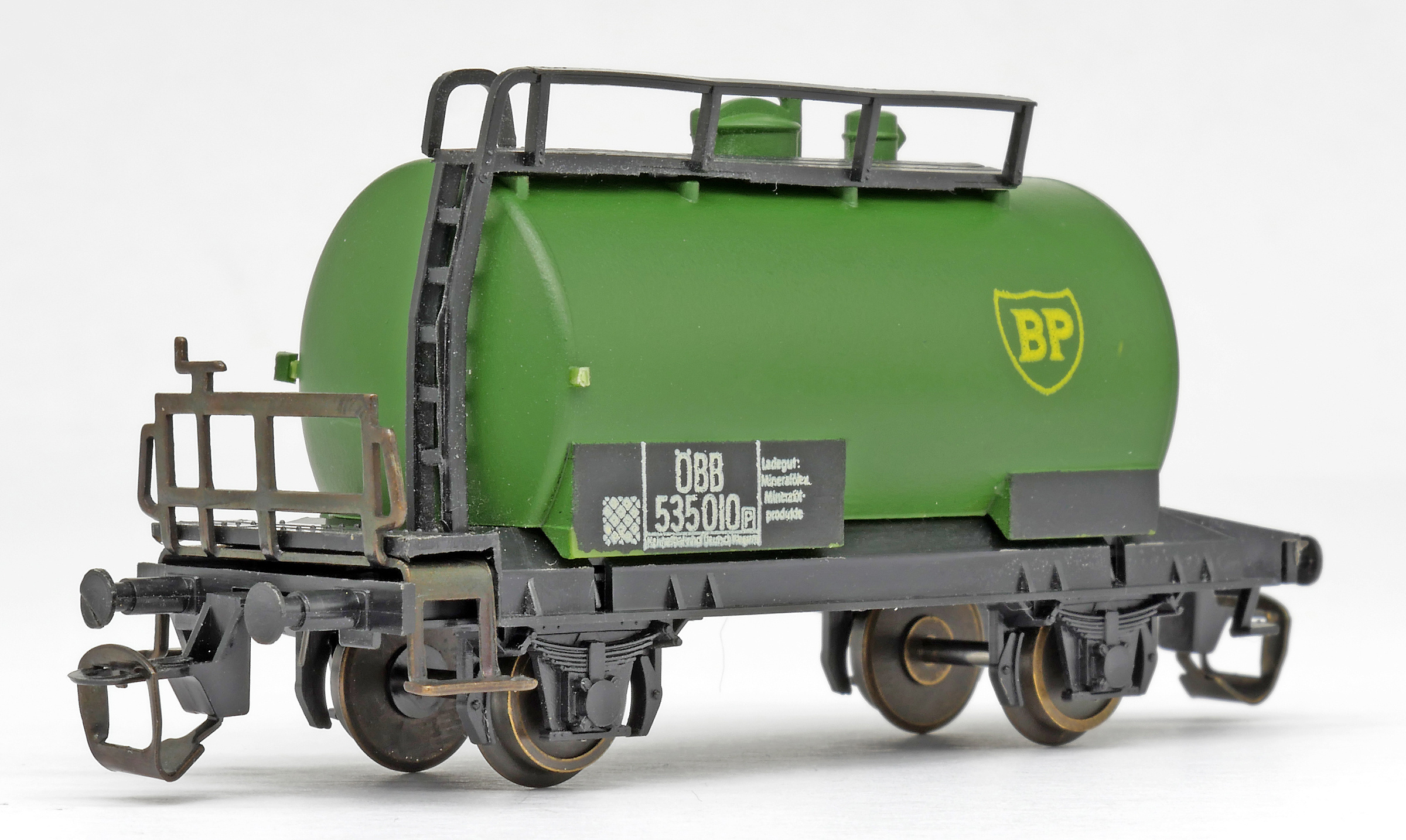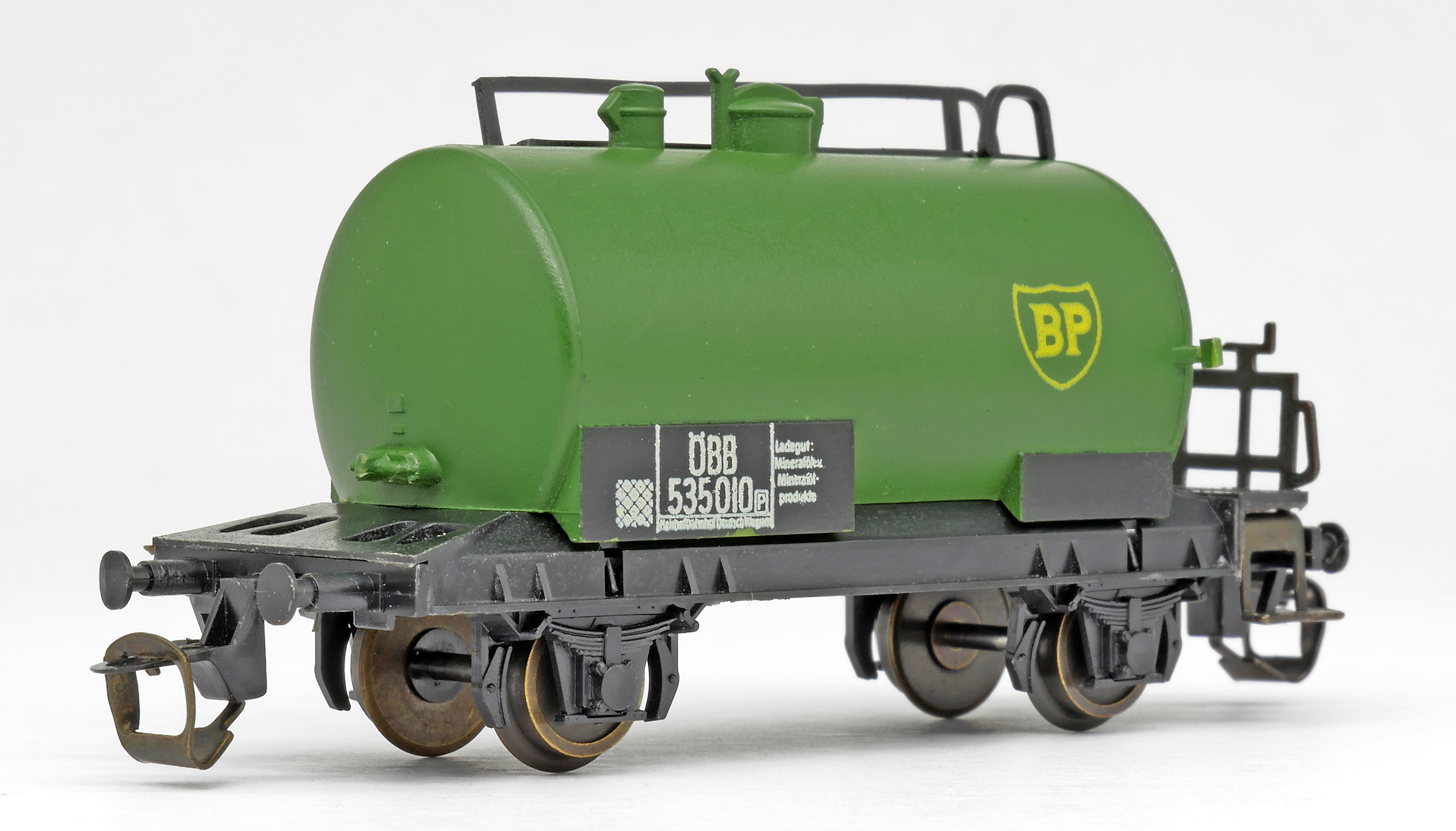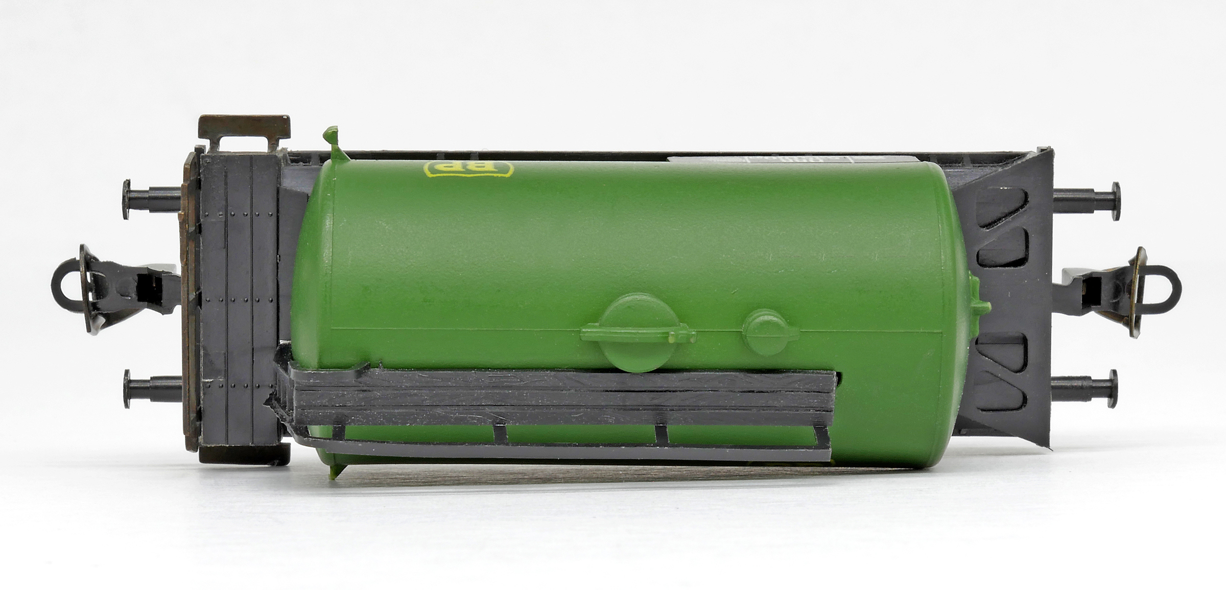 kotlový vůz zelený s černým pojezdem a s logem „BP“