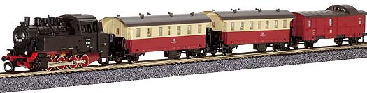 set parní lokomotivy BR 81, dvou osobních a jednoho služebního vozu