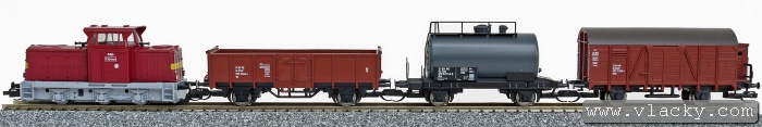 | set motorové lokomotivy a tří nákladních vozů |