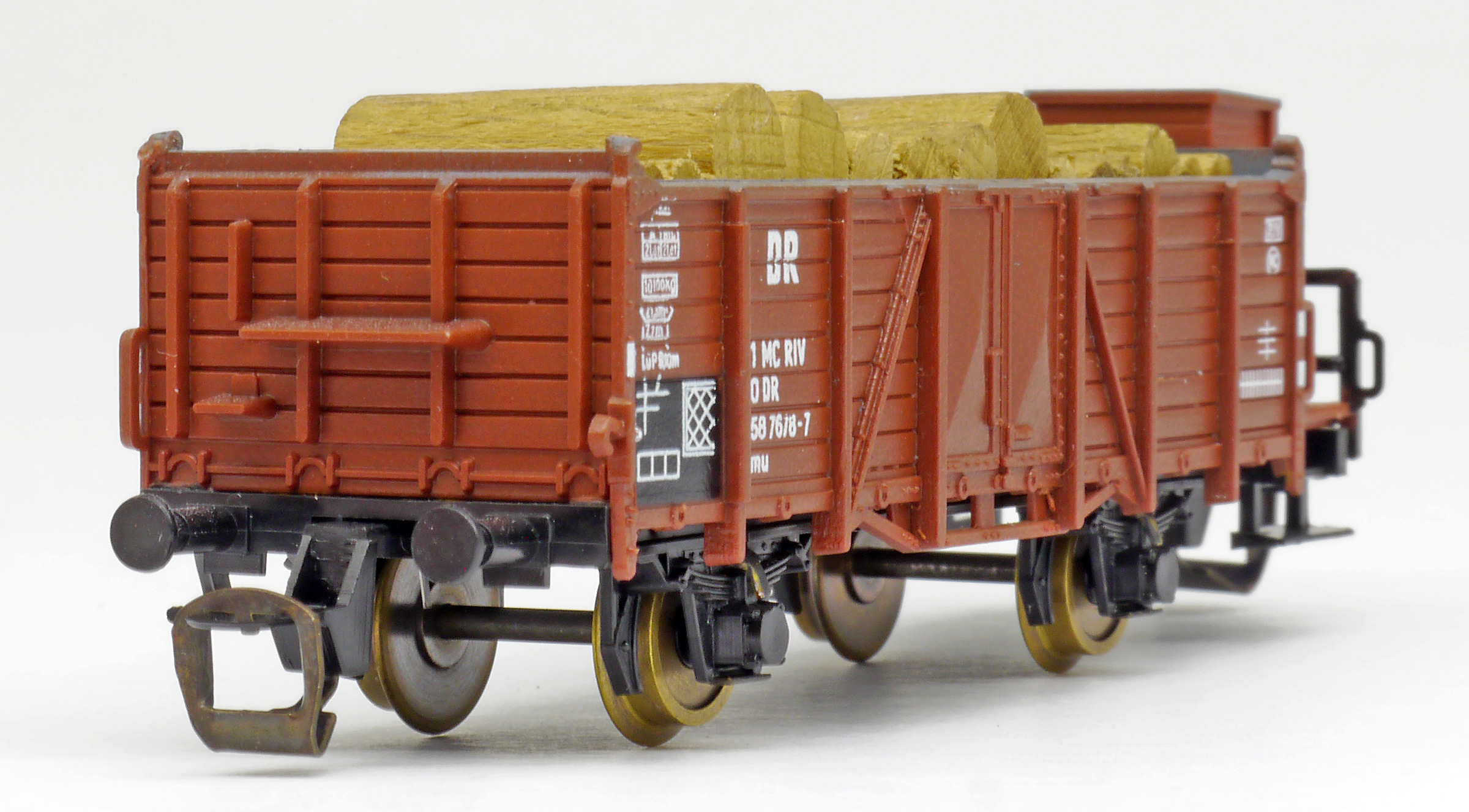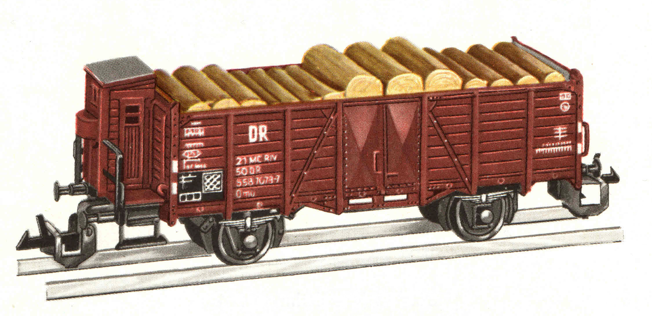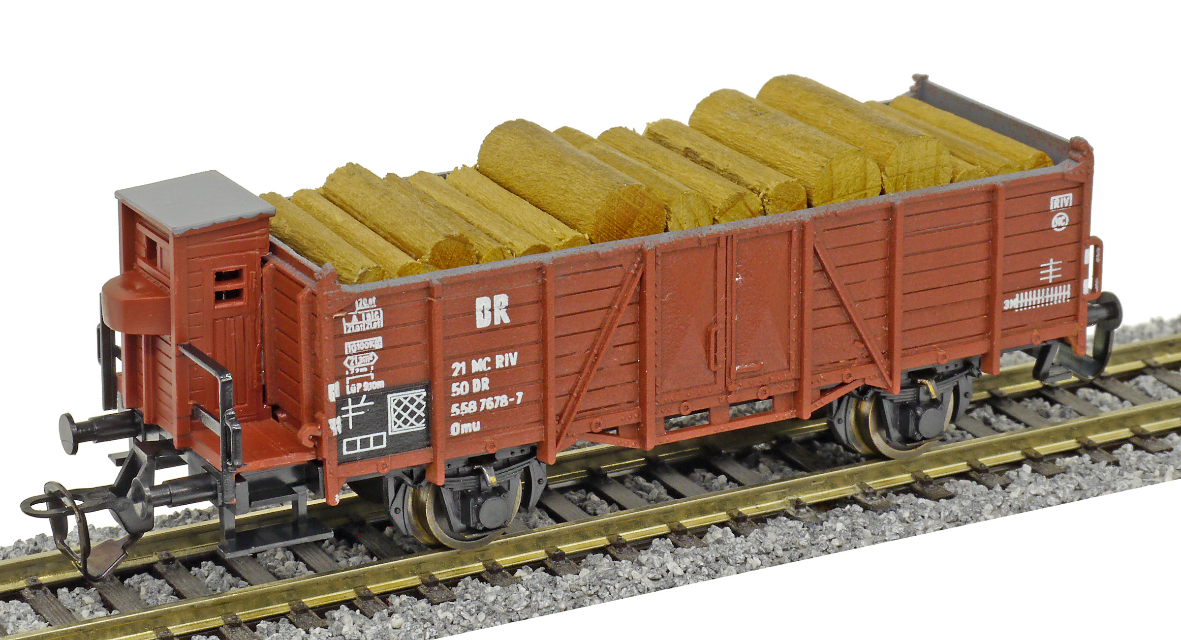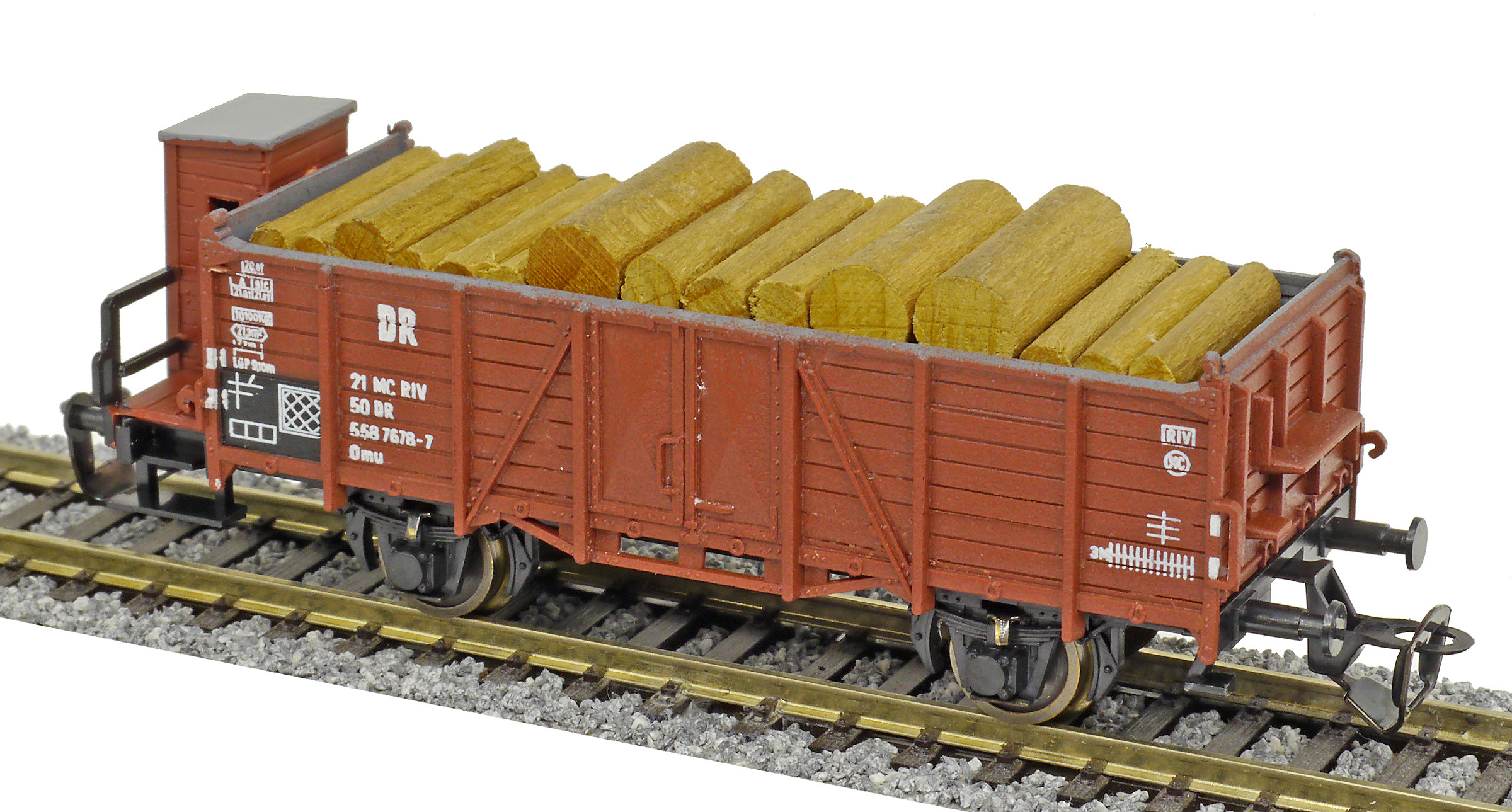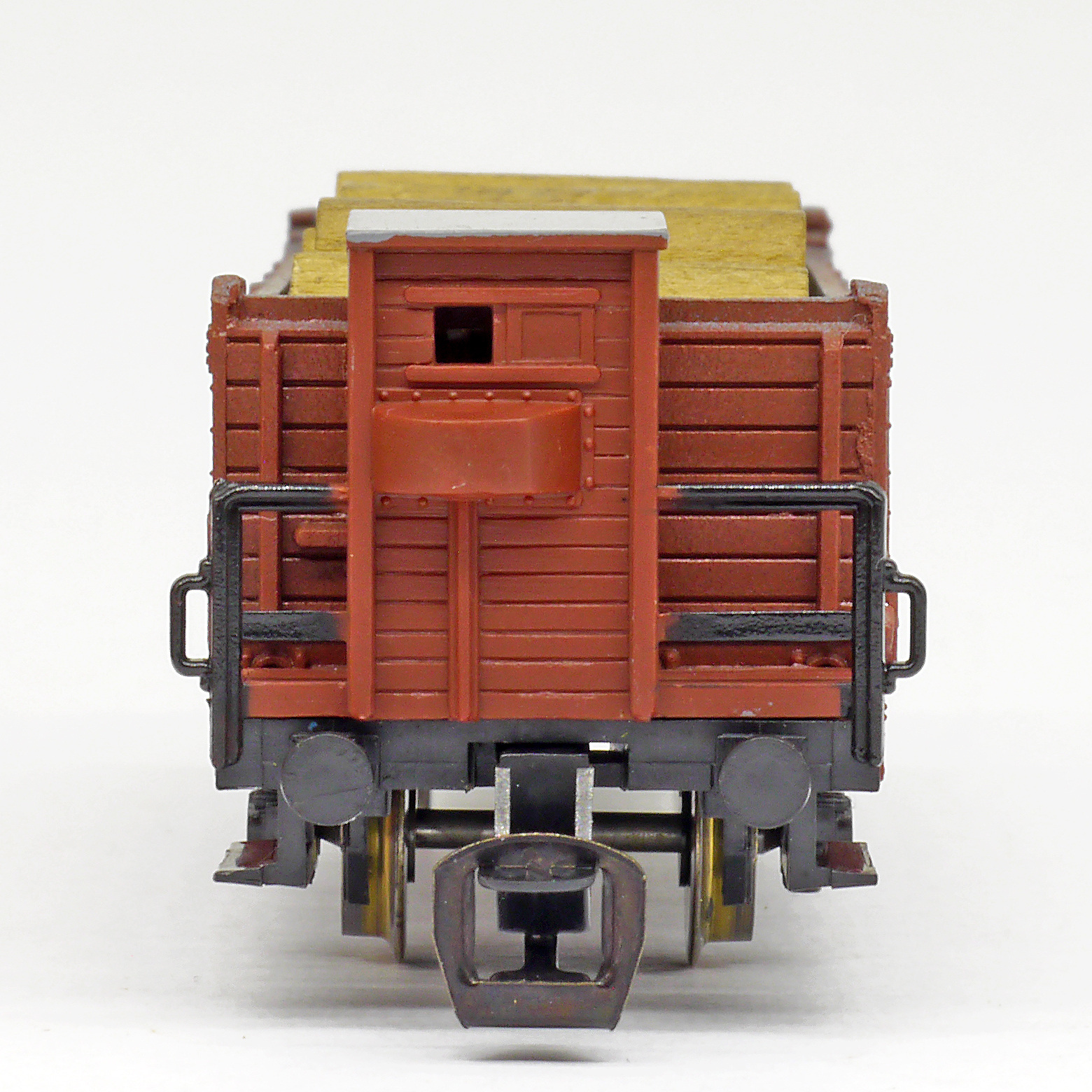 | otevřený nákladní vůz červenohnědý s brzdařskou budkou a nákladem kulatiny |