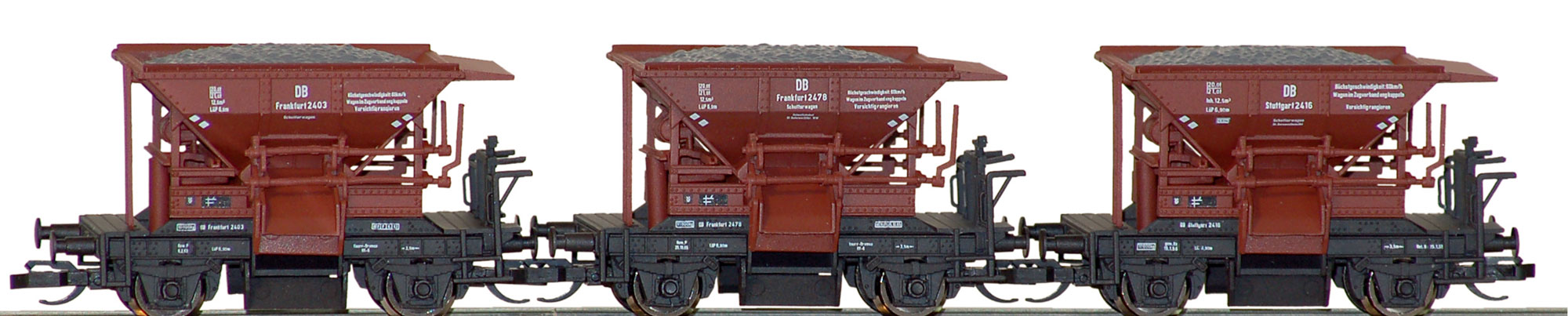 | set tří hnědých samovýsypných vozů typu Talbot s nákladem |