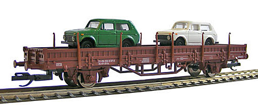 | nízkostěnný nákladní vůz červenohnědý s nákladem dvou automobilů Lada Niva |