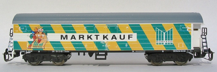 Popis   nákladní chladící vůz bílý s šedou střechou a potiskem „MARKTKAUF“