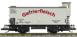 | nákladní chladící vůz bílý s šedou střechou a brzdařskou budkou „Gefrierfleisch“ |