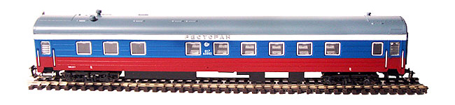 modrý-červený s bílým pruhem a šedou střechou "Rossija", jídelní