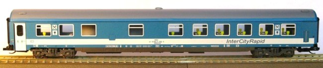 modrý s bílým pásem a šedou střechou jídelní "InterCityRapid"