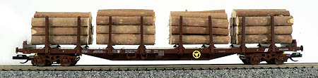 | nákladní plošinový vůz hnědý s klanicemi s nákladem kulatiny |