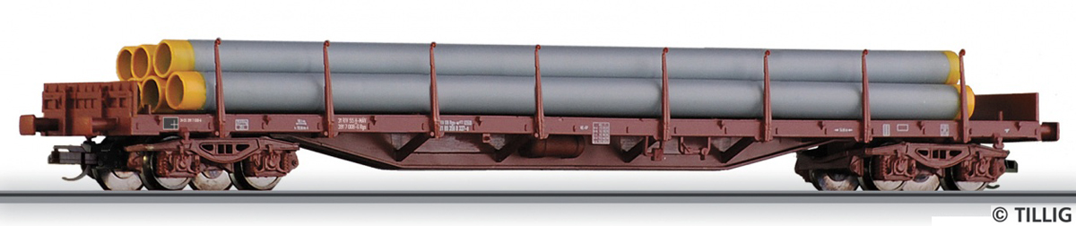 | nákladní plošinový vůz červenohnědý s nákladem rour |