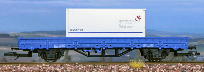 | nízkostěnný nákladní vůz modrý s nákladem kontejneru „Nürnberg 2011“ |