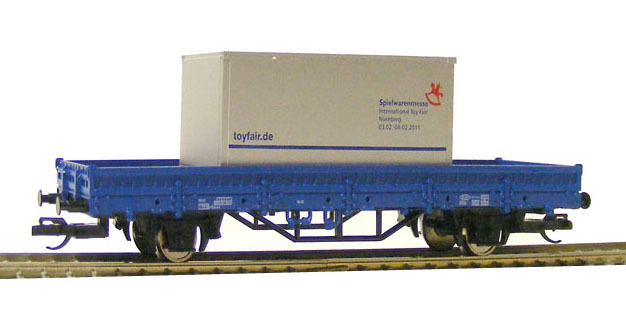 | nízkostěnný nákladní vůz modrý s nákladem kontejneru „Nürnberg 2011“ |