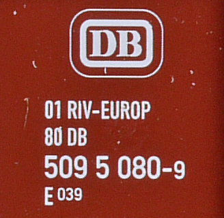 | • 01 80 509 5 080-9 | → | nákladní, nezávislé nápravy, pevný rozchod, ve vlastnictví železniční správy, RIV, EUROP/IF |