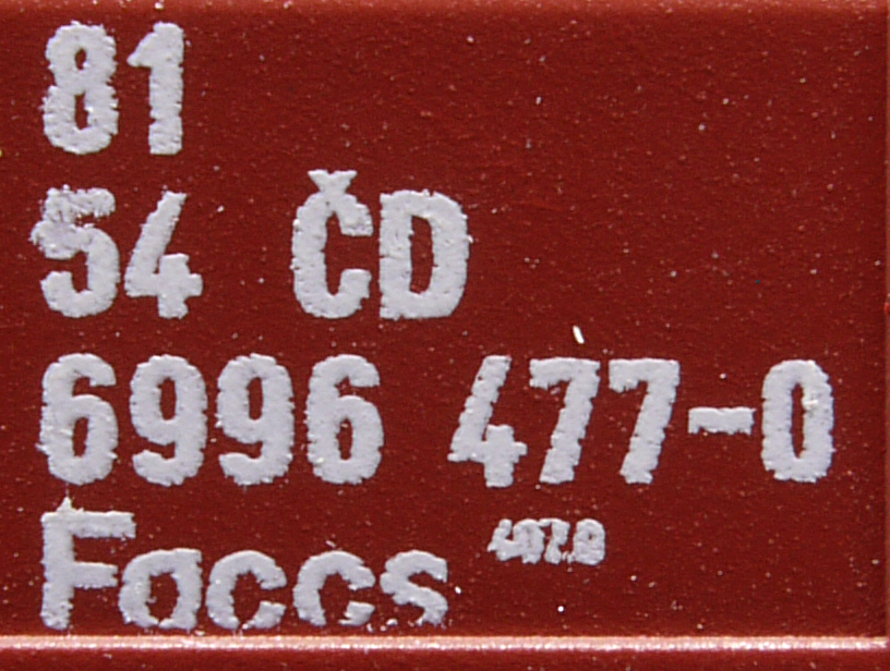 | • 81 54 6996 477-0 | → | nákladní, s podvozky, ve vlastnictví železniční správy, pro mezinárodní dopravu dle zvláštních umluv |