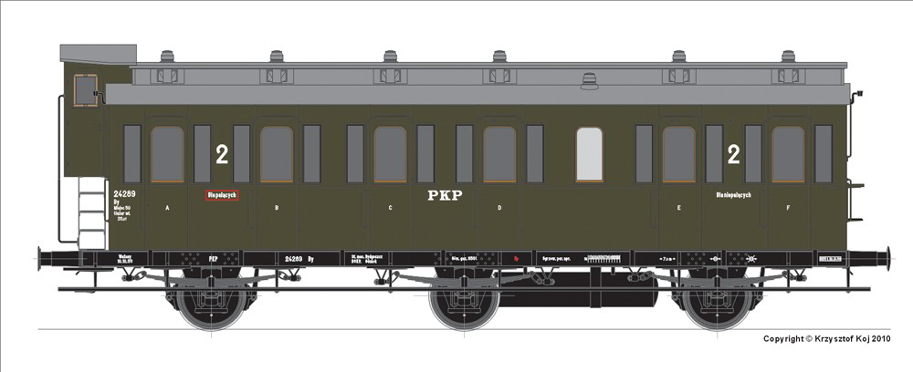 oddílový osobní vůz zelený s šedou střechou a brzdařskou budkou 2. tř., st. Bydgoszcz