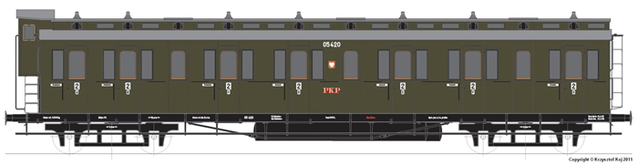 oddílový osobní vůz zelený s šedou střechou a brzdařskou budkou 2. tř., st. Katowice