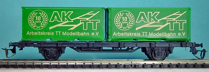 | plošinový nákladní vůz se dvěma zelenými kontejnery 20' „10 Jahre AKTT“ |