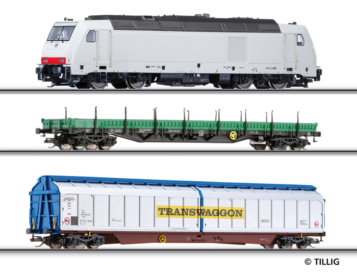 | set dieselové lokomotivy BR 285 a dvou nákladních vozů |