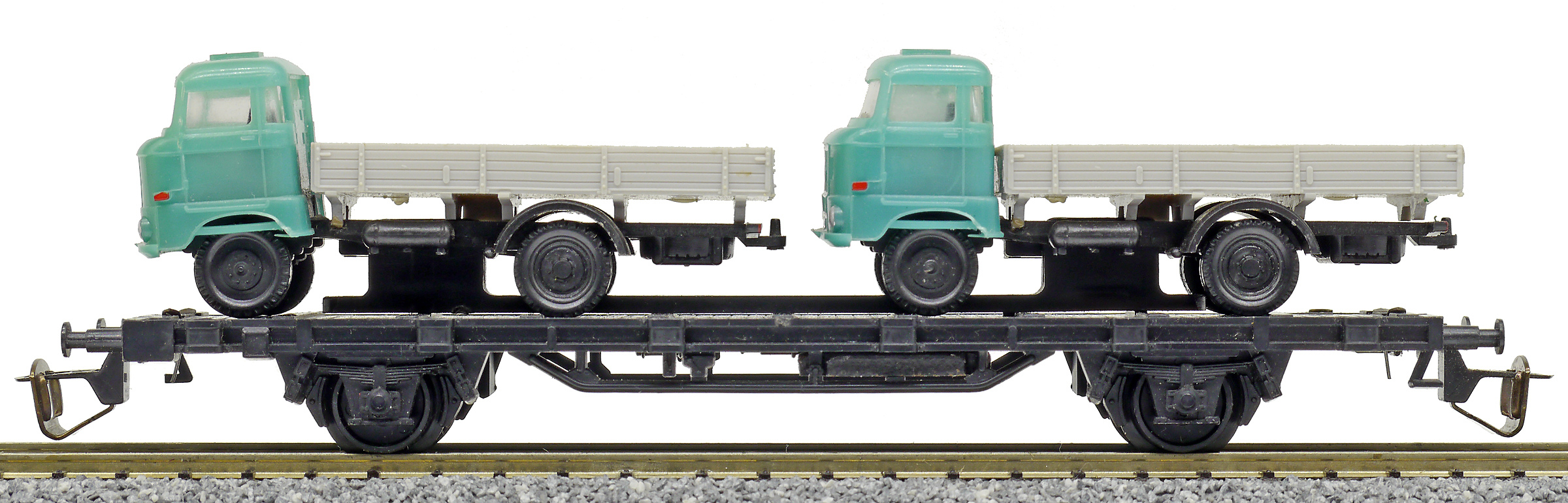 | plošinový vůz černý s nákladem dvou automobilů W50 |