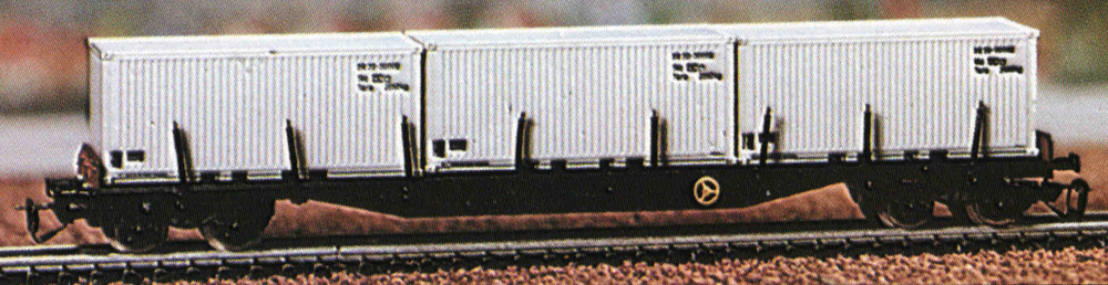 nákladní plošinový vůz černý se třemi bílými kontejnery