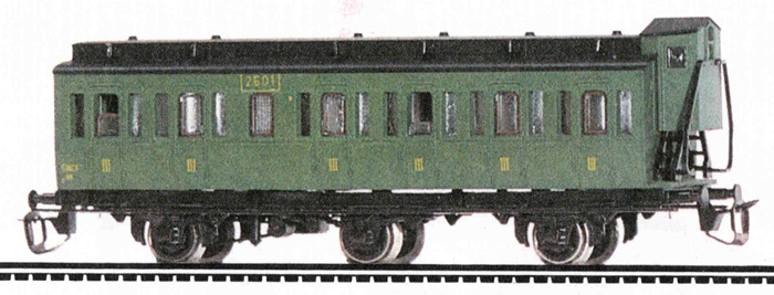 oddílový osobní vůz zelený s černou střechou a brzdařskou budkou 3. tř.