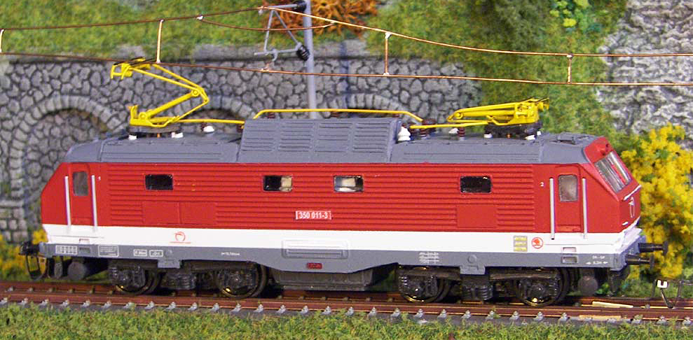 červená-bílá, šedá střecha, žluté polopantografy