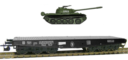 | plošinový vůz černý s nákladem tanku T54 |