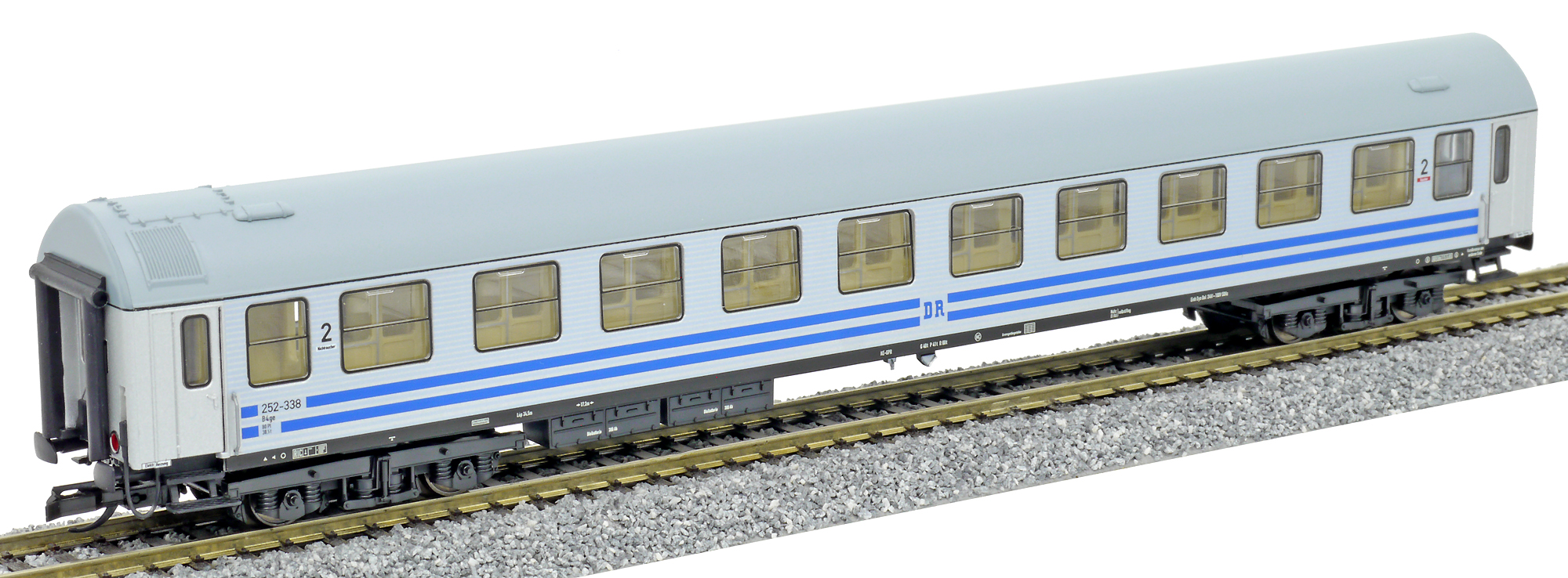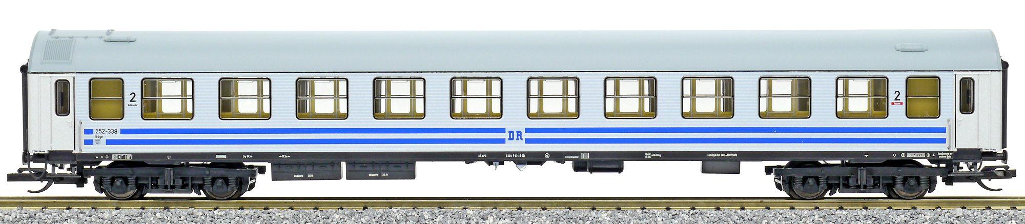 rychlíkový vůz stříbrný se dvěma modrými proužky a šedou střechou 2. tř.