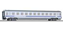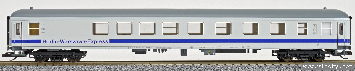 | rychlíkový vůz bílý s modrým pásem a šedou střechou 2. tř. „Berlin-Warszawa-Express“ |