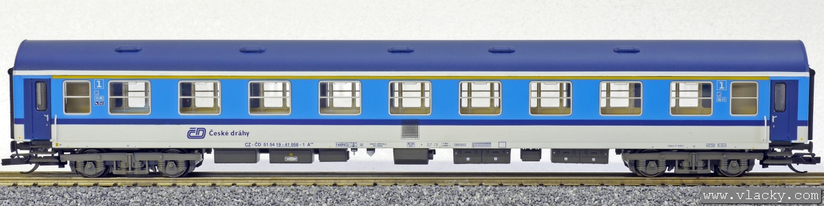 Popis   rychlíkový vůz modrý-bílý v barevném chematu „Najbrt“ 1. tř.