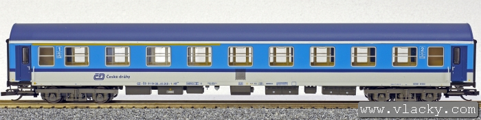 Popis   rychlíkový vůz modrý-bílý v barevném chematu „Najbrt“ 1./2. tř.