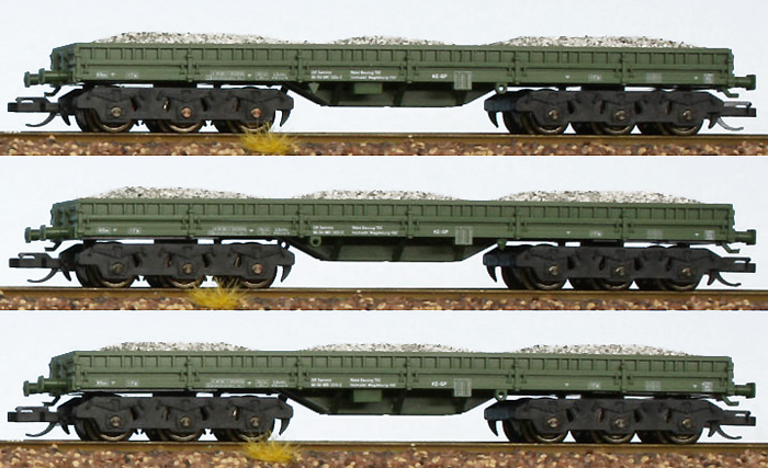 | set tří zelených vozů do pracovního vlaku ložených stěrkem |