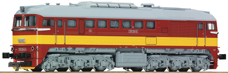 | dieselová lokomotiva červená se žlutým výstražným pruhem, šedá střecha a pojezd |