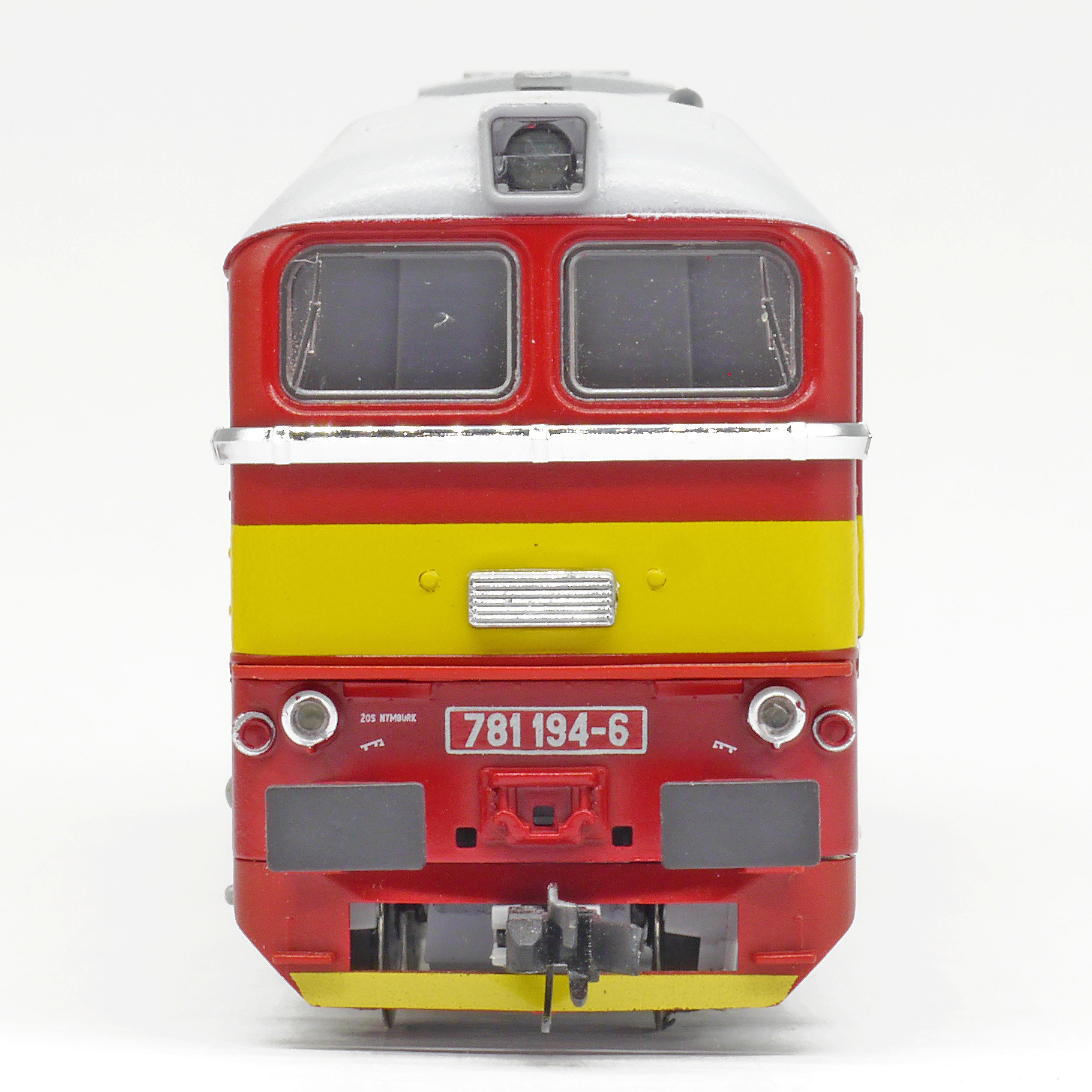 | dieselová lokomotiva červená se žlutým výstražným pruhem, šedá střecha a pojezd |