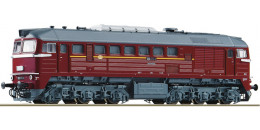 | dieselová lokomotiva červená s tmavě šedou střechou a pojezdem |