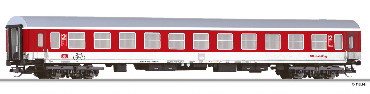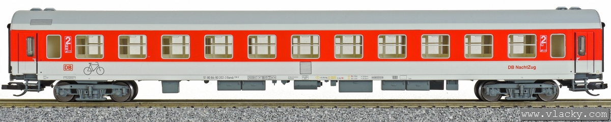 | rychlíkový vůz červený-bílý s šedou střechou „DB-Nachtzug“ |