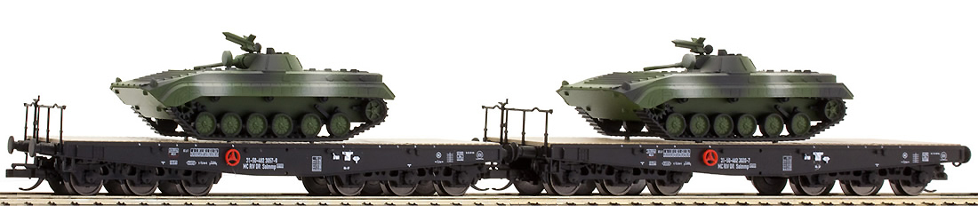 | set dvou plošinových vozů s patinovanými BMP-1 „Militärtransport“ |