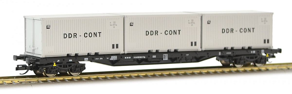 Popis   nákladní plošinový vůz černý s nákladem tří kontejnerů „DDR-CONT“