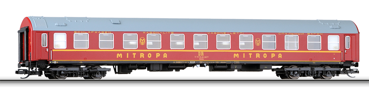 lůžkový vůz červený s šedou střechou „MITROPA“