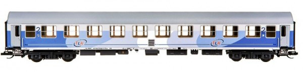 rychlíkový vůz v barvách „TLK” s šedou střechou 2. tř.