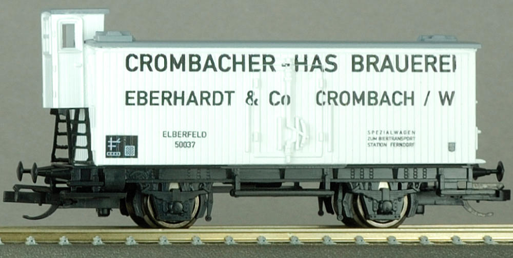 bílý s šedou střechou a brzdařskou budkou „Crombacher-Has Brauerei Eberhardt & Co.”