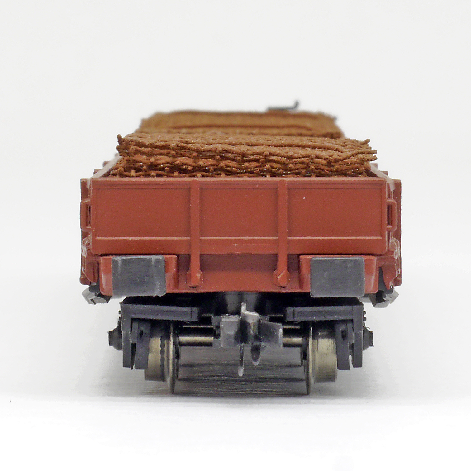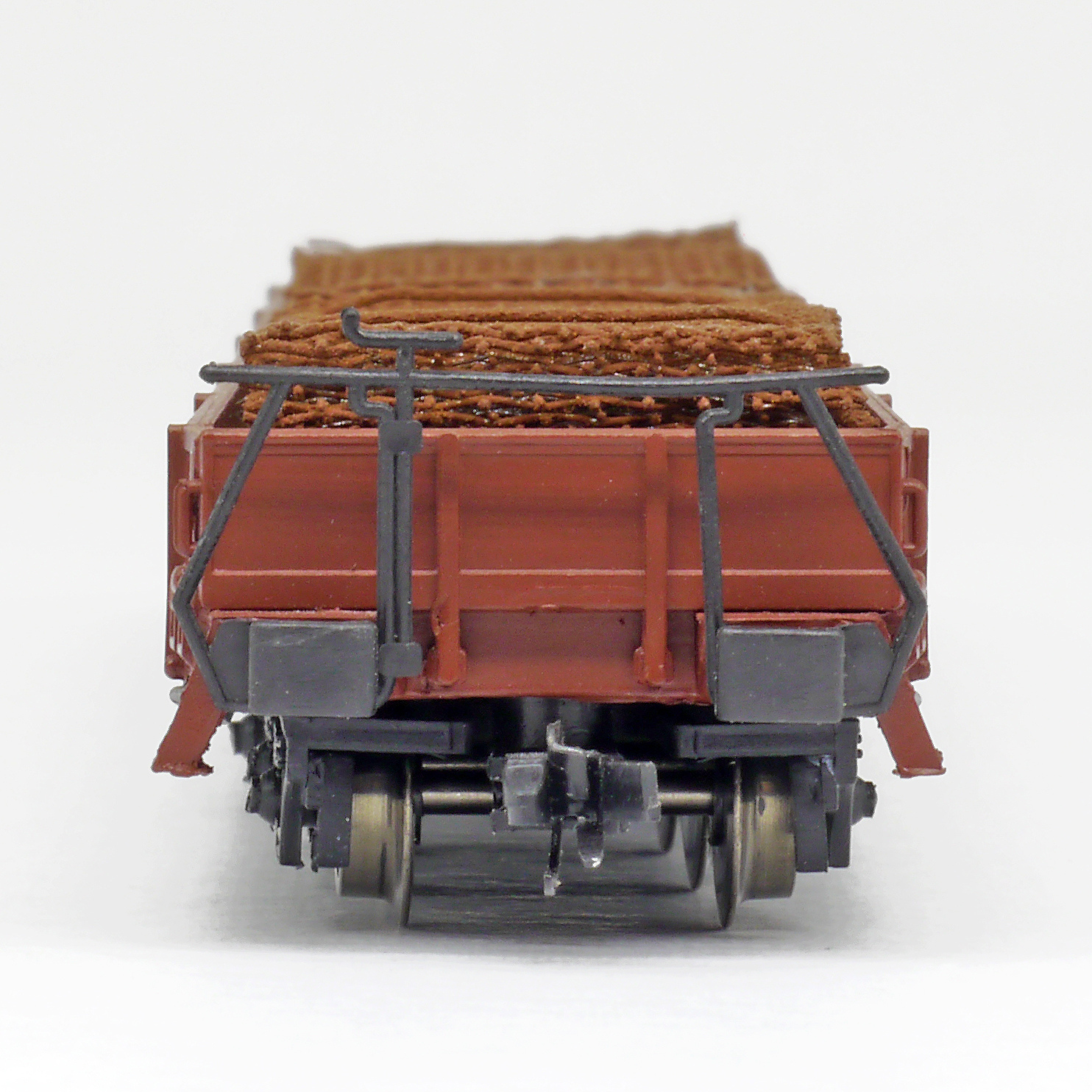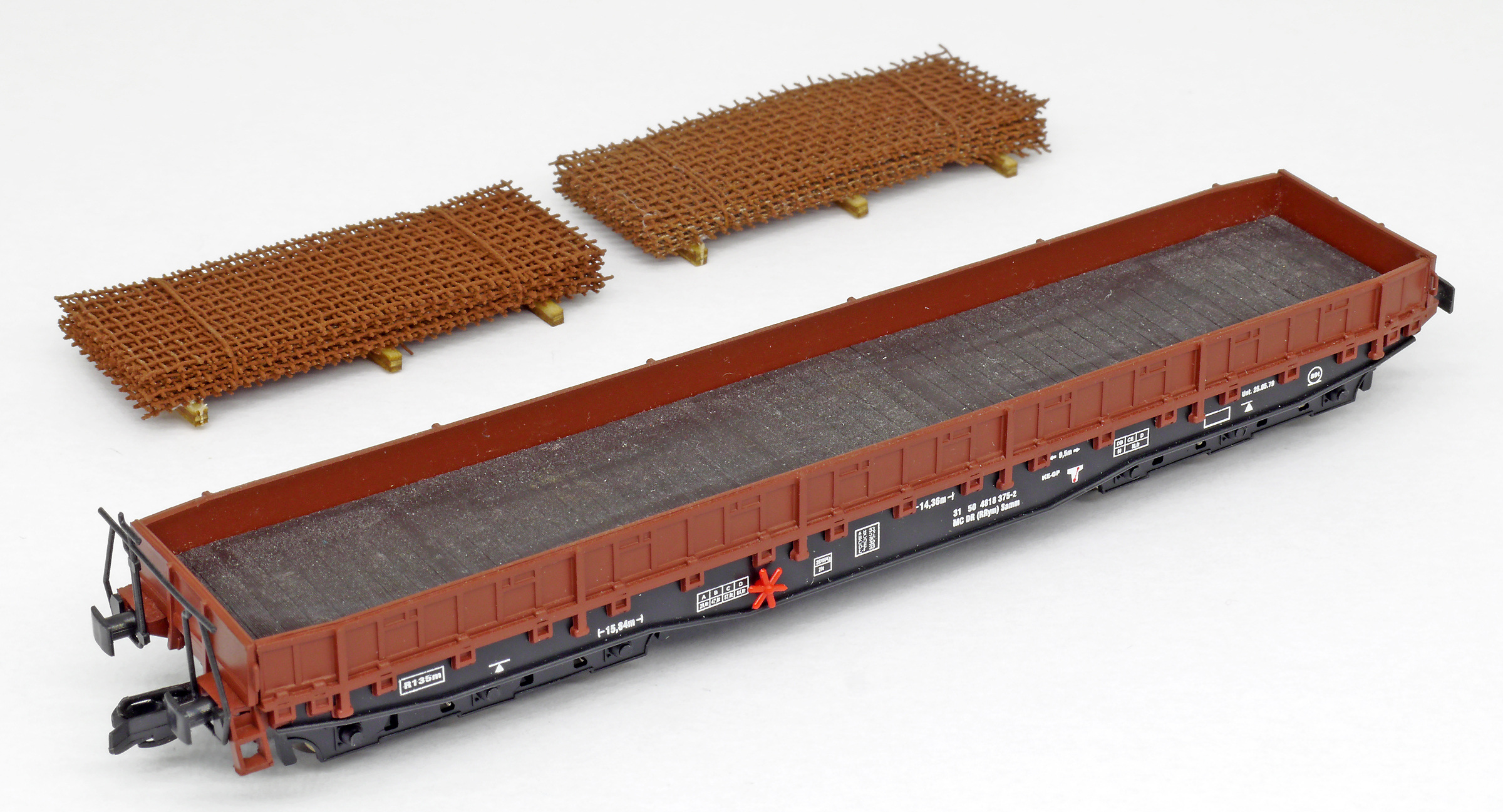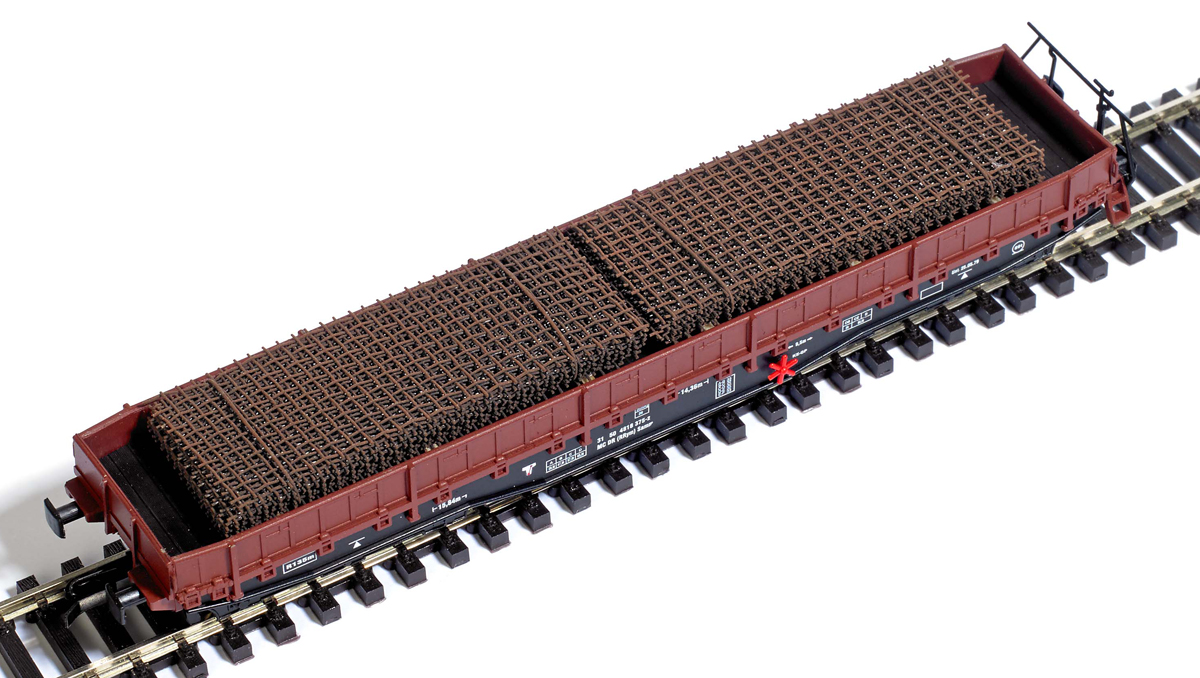 | nízkostěnný nákladní vůz červenohnědý s černým rámem a s nákladem svařovaného armovacího pletiva |