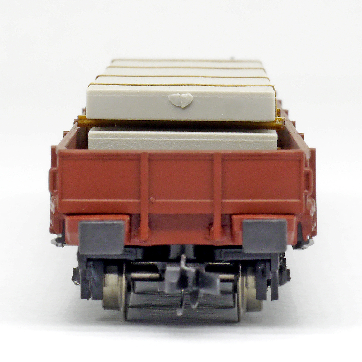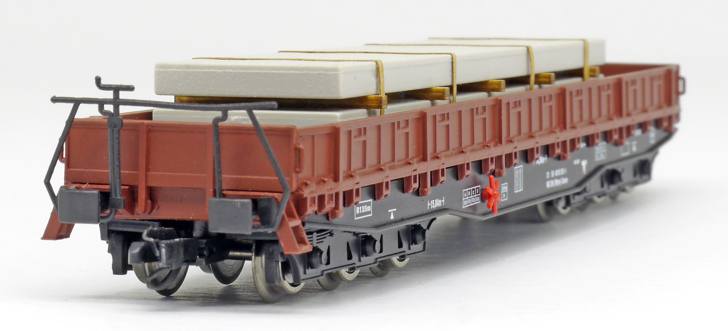 | nízkostěnný nákladní vůz červenohnědý s černým rámem a s nákladem betonových desek |