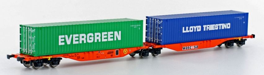 | dvoudílný kontejnerový vůz modrý s nákladem dvou kontejnerů 40' „Evergreen Loyd“ |
