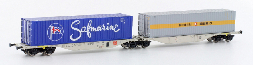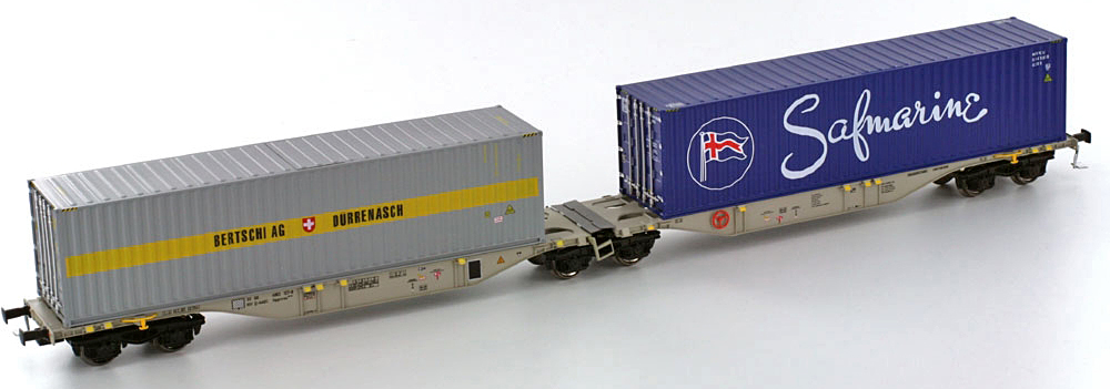 | dvoudílný kontejnerový vůz modrý s nákladem dvou kontejnerů 40' „Bertschi“ |