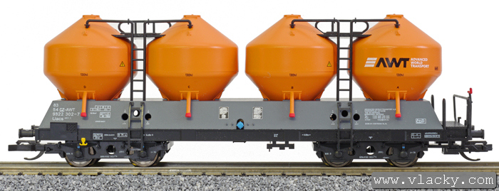| nákladní samovýsypný vůz šedý-oranžový s oranžovými nádobami s logem „AWT“ |