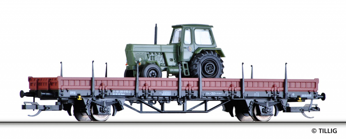 | nízkostěnný nákladní vůz červenohnědý s nákladem traktoru „NVA“ |