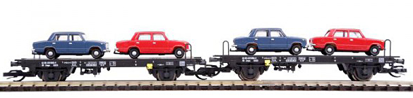 | set dvou plošinových vozů s nákladem automobilů Lada |