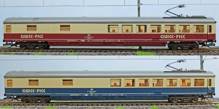 | modrý-slonová kost, šedá střecha s pantografem, jídelní vůz „QuickPick“ |