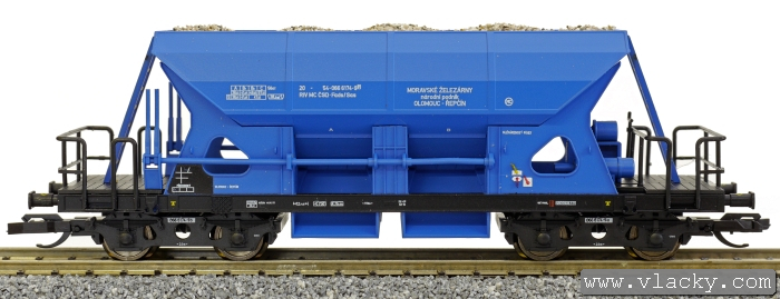 | nákladní samovýsypný vůz modrý s nákladem štěrku „Moravské železárny“ |