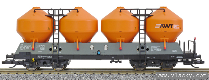| nákladní samovýsypný vůz šedý s oranžovými nádobami s logem „AWT“ |