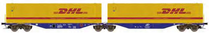 | dvoudílný kontejnerový vůz modrý se dvěma žlutými kontejnery 45' „DHL“ |